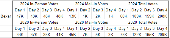 As you can see, the in-person turnout in Bexar County is much higher than in 2020, but the mail-in votes are much lower.
