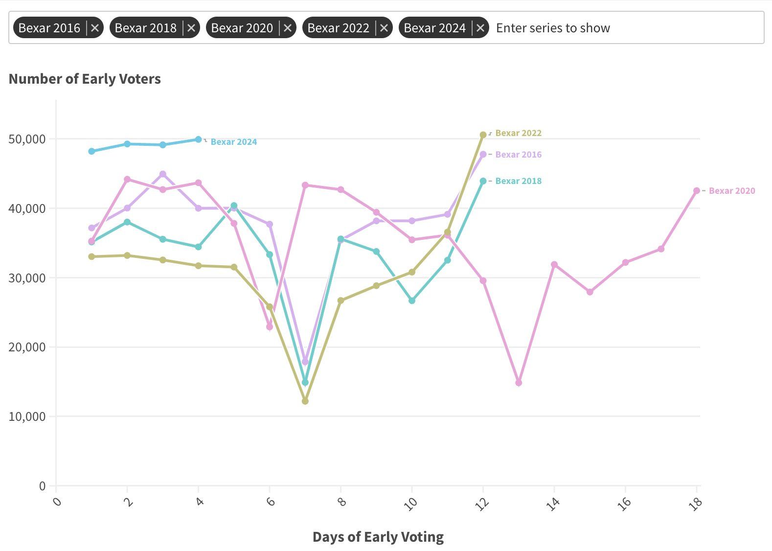 What does it all mean? According to Chris, at the end of Day 4 in 2024, Bexar County’s total vote count was 813 votes less than it was on Day 4 in 2020.