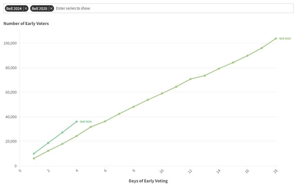 Bell County is another county we’re keeping a close eye on. Their total number exceeds any previous election. Two Texas House seats in Bell County are up for flip. Many consider Bell County a blue county with low voter turnout. Maybe this will be the year they finally change that.