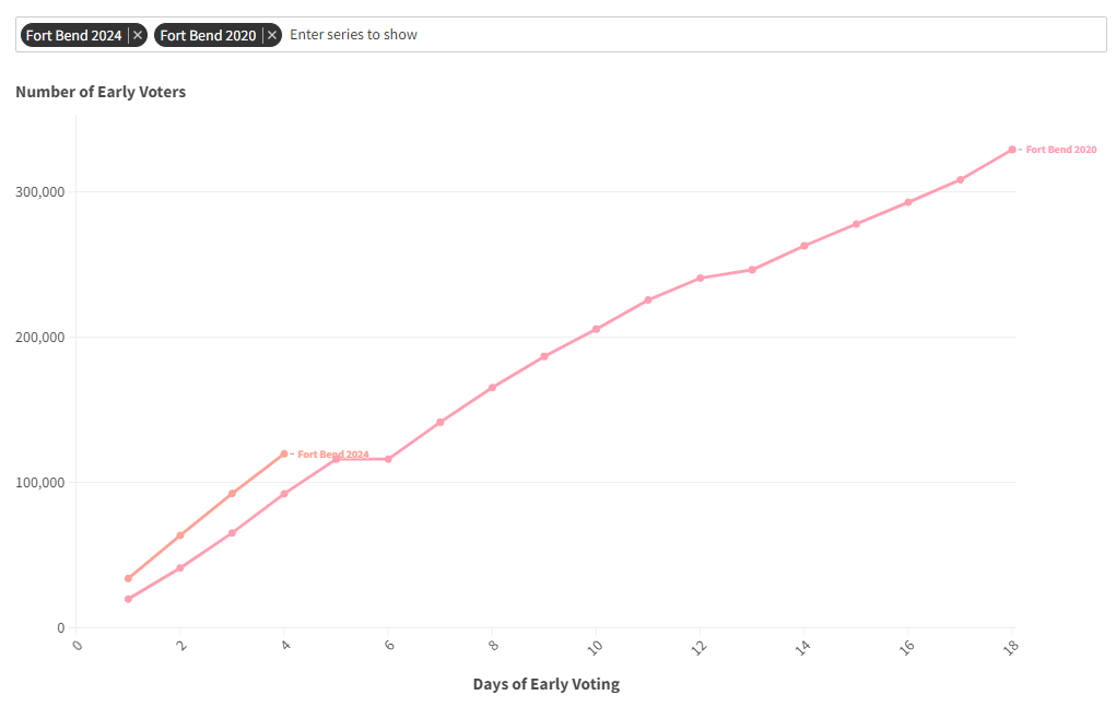 Fort Bend County’s total turnout in 2020 was 92,236; in 2024, that number will be 119,756. Fort Bend County is a blue county that is only getting bluer, and this gives us some clues into how suburban Democrats will turn out.