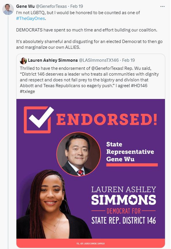 It started with Representative Gene Wu (D-Houston) endorsing Lauren Simmons and expressing his disgust with Thierry’s bigotry.