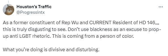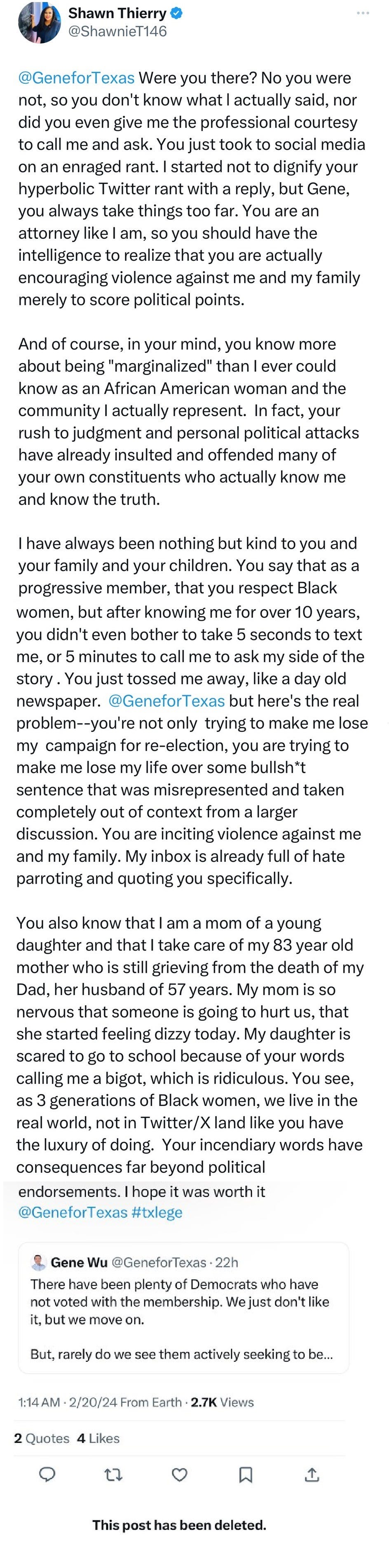 The biggest takeaway from this is the thought that Representative Wu was her friend and was upset her friend was calling her a bigot, even though she has repeatedly acted out her bigotry. She also insinuated that the Houston Chronicle was dishonest in what they reported, a claim she never made until this post.
