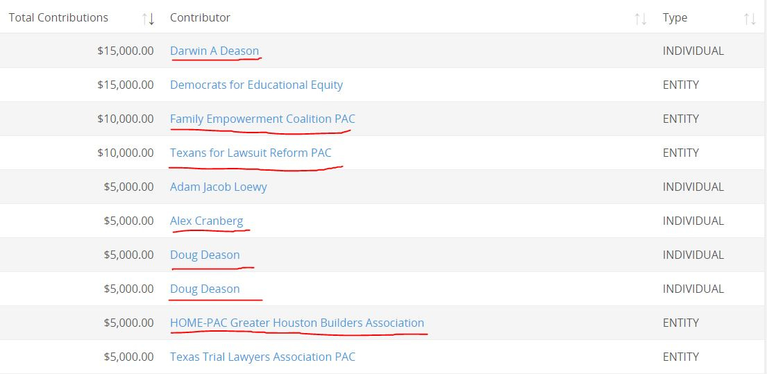 After Thierry’s crying for bigotry stunt back in May, right-wing donors dumped large piles of cash into her campaign. Check it out. All of the names underlined in red are Republican donors and PACs.