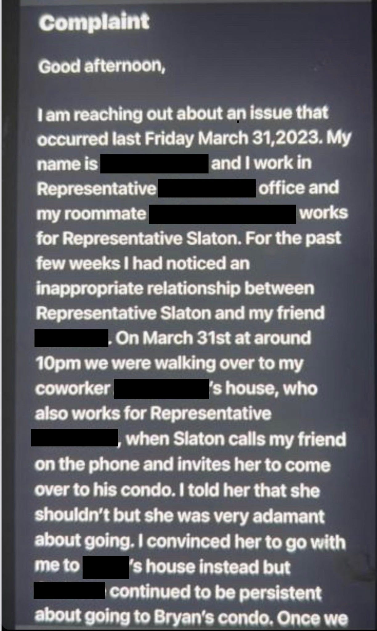 Today, the full complaint was sent to Lone Star Left and has since been verified and authenticated. You can read the full complaint below (trigger warning for grooming activity).