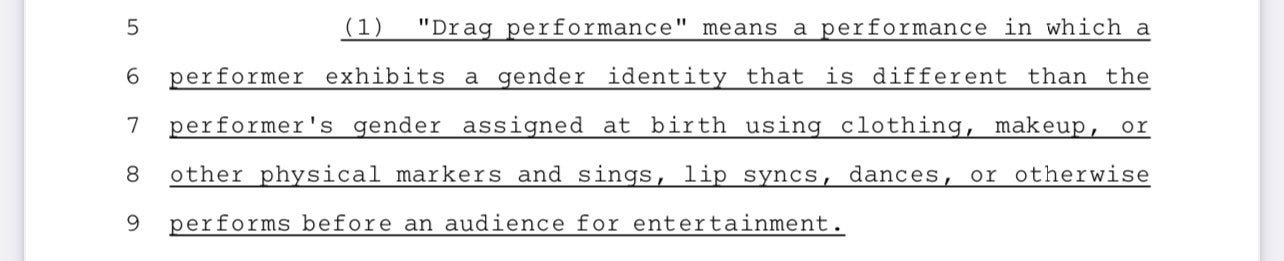 According to the bill that Nate Schatzline filed, a “drag performance” is when a performer exhibits a gender identity that is different than the performer’s gender at birth.