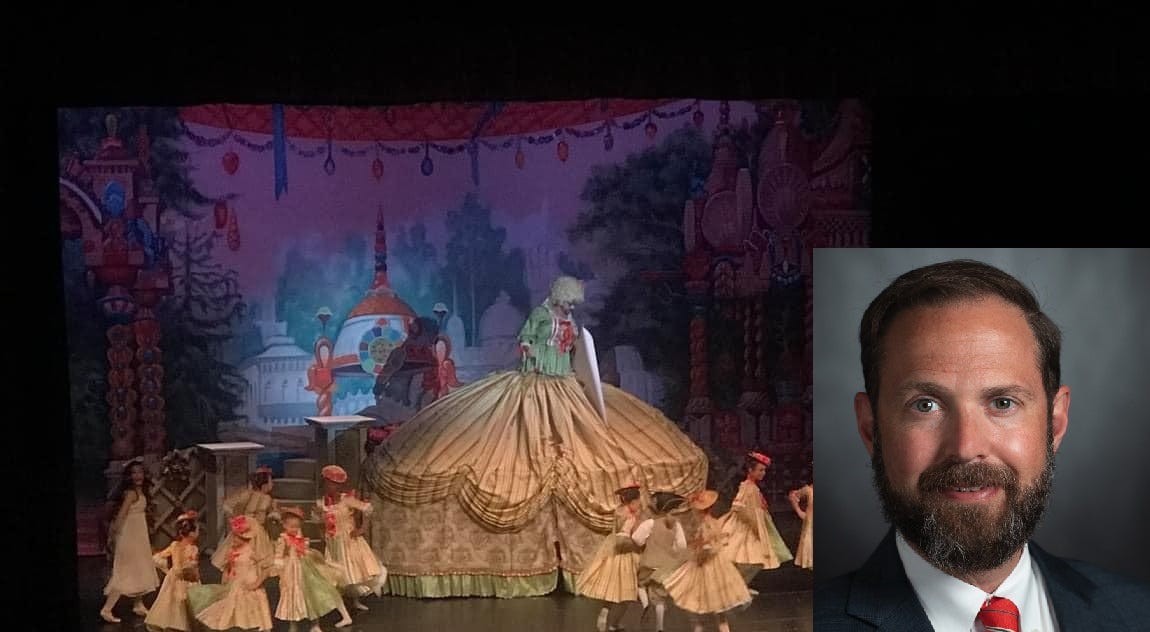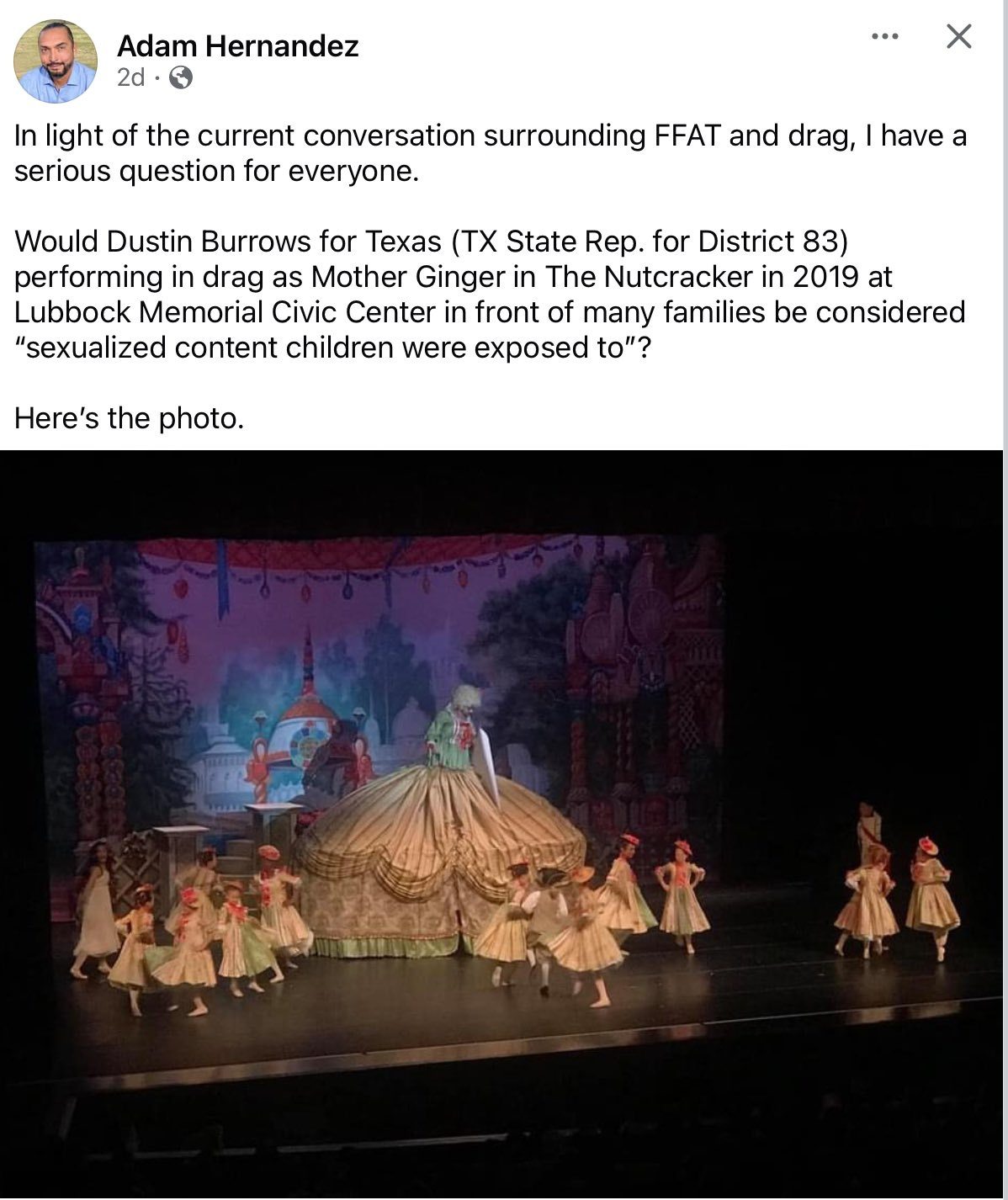Apparently, in 2019, Dustin Burrows performed in drag as Mother Ginger in The Nutcracker at the local Civic Center.