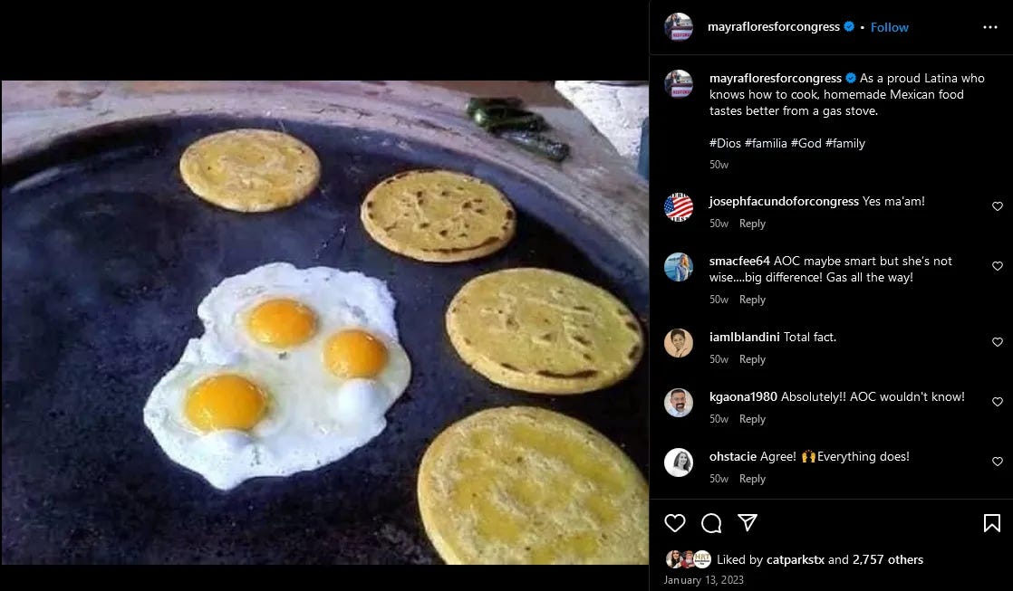 In the kitchen of credibility, it appears Mayra’s only specialty is reheating others’ leftovers, like this post, where she claims to be a “proud Latina who knows how to cook” and says that homemade Mexican food tastes better from a gas stove.