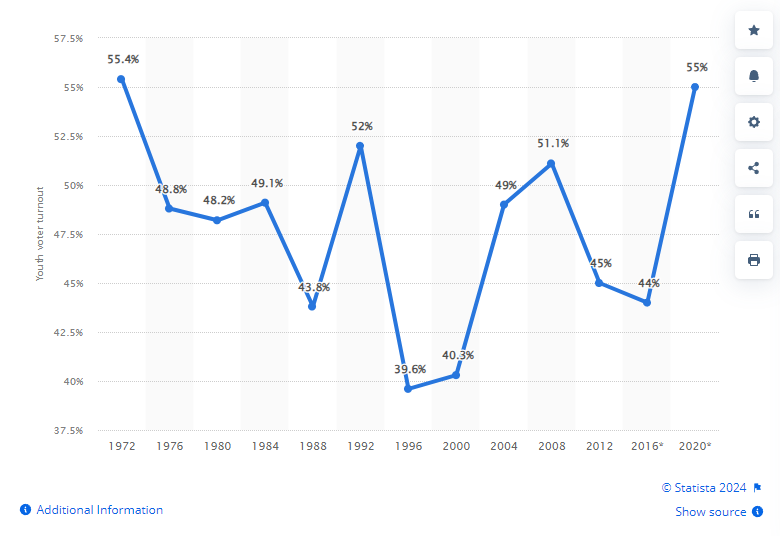 Here has been the youth turnout in America for presidential elections over the last 50 years: