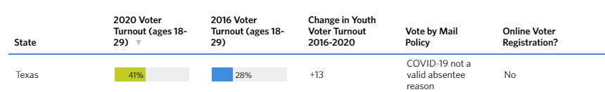 The national turnout for youth in 2020 was 55%. Unfortunately, in Texas it was only 41%.