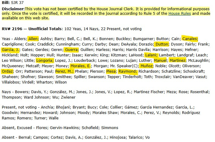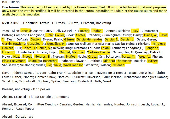 Most Democrats (highlighed below) voted in favor of HJR35 and I’m sure it’s because no one told them not too, and they’re probably looking at it as an infrastructure bill.