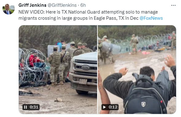 Also today, FoxNews reporter Griff Jenkins captured the Texas National Guard blocking migrants from requesting asylum at an entry point near the International Bridge frequently used for crossing. They used riot shields to push people back, including women and children. In one video, they’re seen tossing a man to the ground.