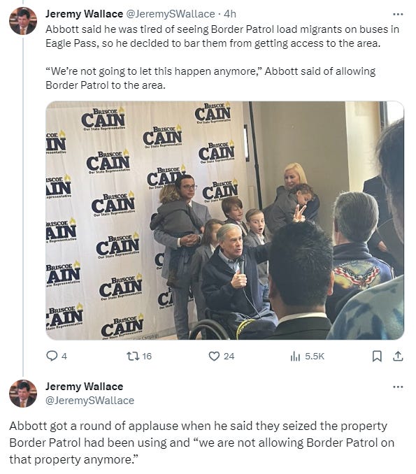 This comes on the heels of Abbott’s latest political stunt. Early yesterday morning, Abbott signed an order for the Texas National Guard to seize Shelby Park and 2.5 miles along the border in Eagle Pass. The city of Eagle Pass did not authorize them to take the land, and the community members were furious. Only one day before that, Abbott said on the Dana Loesch Show that the only thing stopping Texas from shooting and murdering migrants at the border was legal ramifications from the Biden Administration.