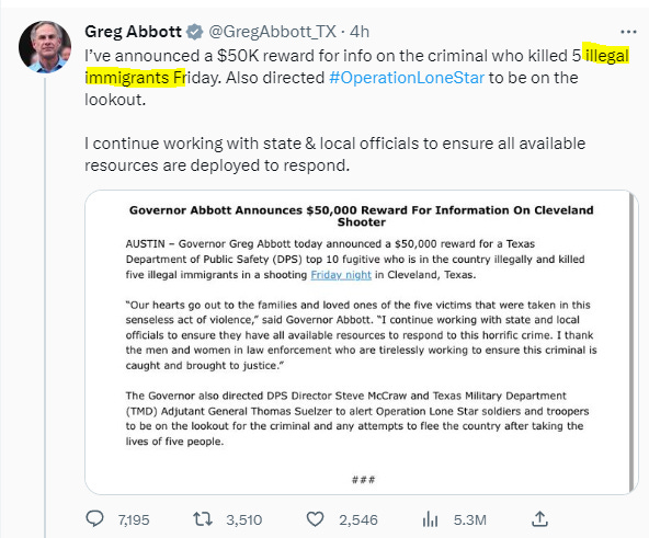 Today, Governor Greg Abbott referred to the five murdered victims in Cleveland, including an eight-year-old boy, as “illegal.”