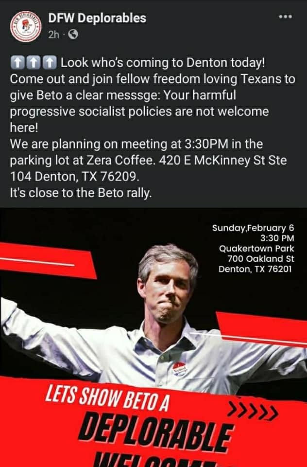 In 2022, before Beto announced he was running for Governor, he did a tour for democracy, traveling the state and talking to people about registering to vote and becoming VDRs. When he came to Denton, Patterson organized a group of local thugs, calling themselves “DFW Deplorables,” to show up to Beto’s event and harass him and event-goers.