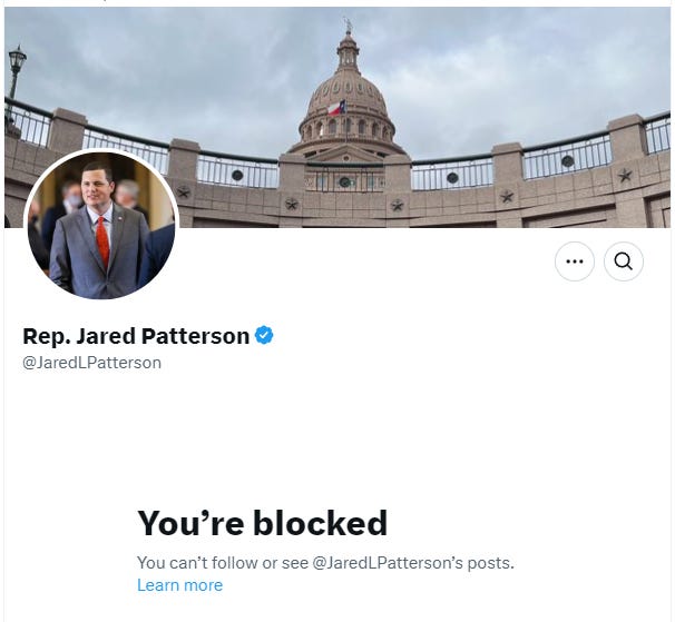 Although, I might have had it coming. During the 87th Legislature, there was a rumor about him and Representative Shelby Slawson getting cozy at one of the bars near the Capitol. All I did was ask him if the rumor was true. Then, he blocked me. 🤷🏻♀️