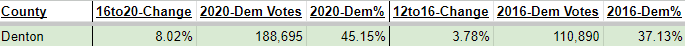 Denton County has been trending blue, and in the last presidential election, they moved +8 points to the left.