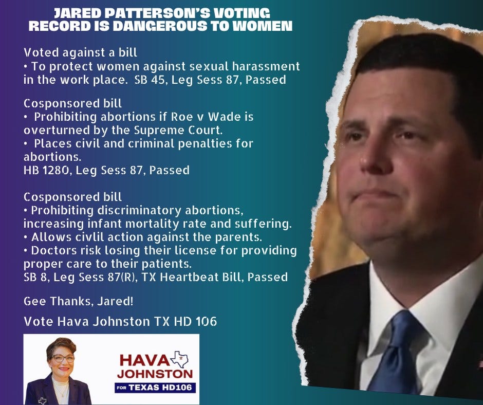 Jared Patterson is a far-right extremist who has voted for or had his name on every harmful piece of legislation to come out of the Texas Legislature over the last three years.