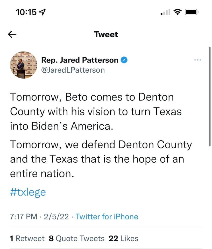 This is when I usually say, “Such-and-so needs no introduction.” But, if you’re a Democrat in Texas who looks up Republicans on social media and you look up Jared Patterson, you’ll probably see this: