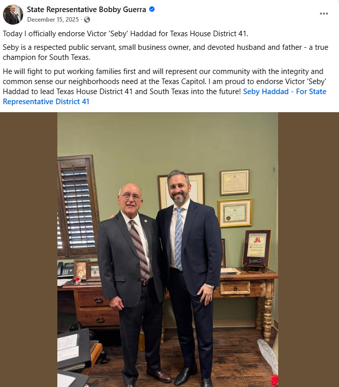 Voter turnout is key to change the establishment politics of this town. In my humble opinion, progressives take a lot more convincing before they take the time to vote. They show up to protests but not the voting polls. Seby Haddad was given the mic at the Builders Association meeting early this week. On a side note, Haddad’s name is a very popular family in McAllen. He spoke up about how bankers are losing money due to ICE raids on construction sites. Eric Holguín was present at same meeting, and he gave good interview to a reporter. Wrote about it on my Substack.