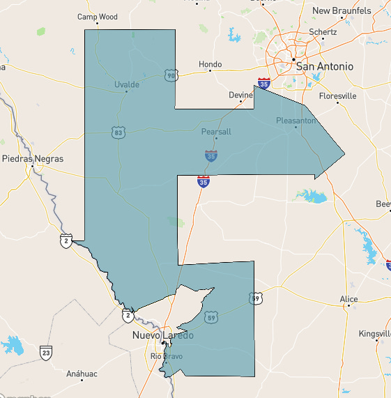 This district encompasses Atascosa, Dimmit, Frio, Uvalde, Webb, and Zavala Counties.