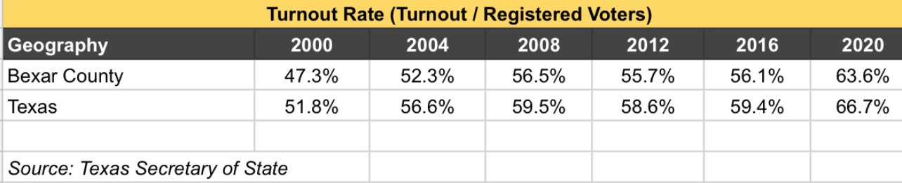 The Bexar County Democratic Party and grassroots organizations should make a big push for turnout this year. A 65%+ turnout would be an accomplishment.