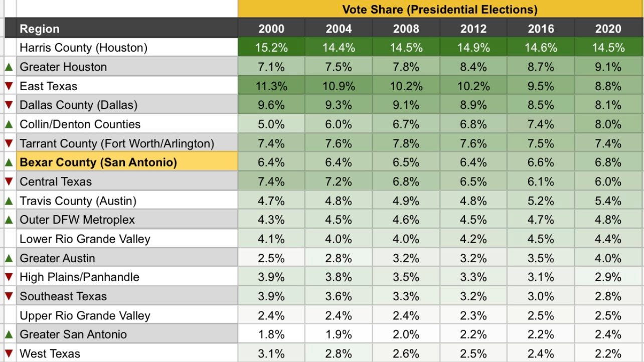Bexar County accounts for 6.8% of the total vote share in Texas.