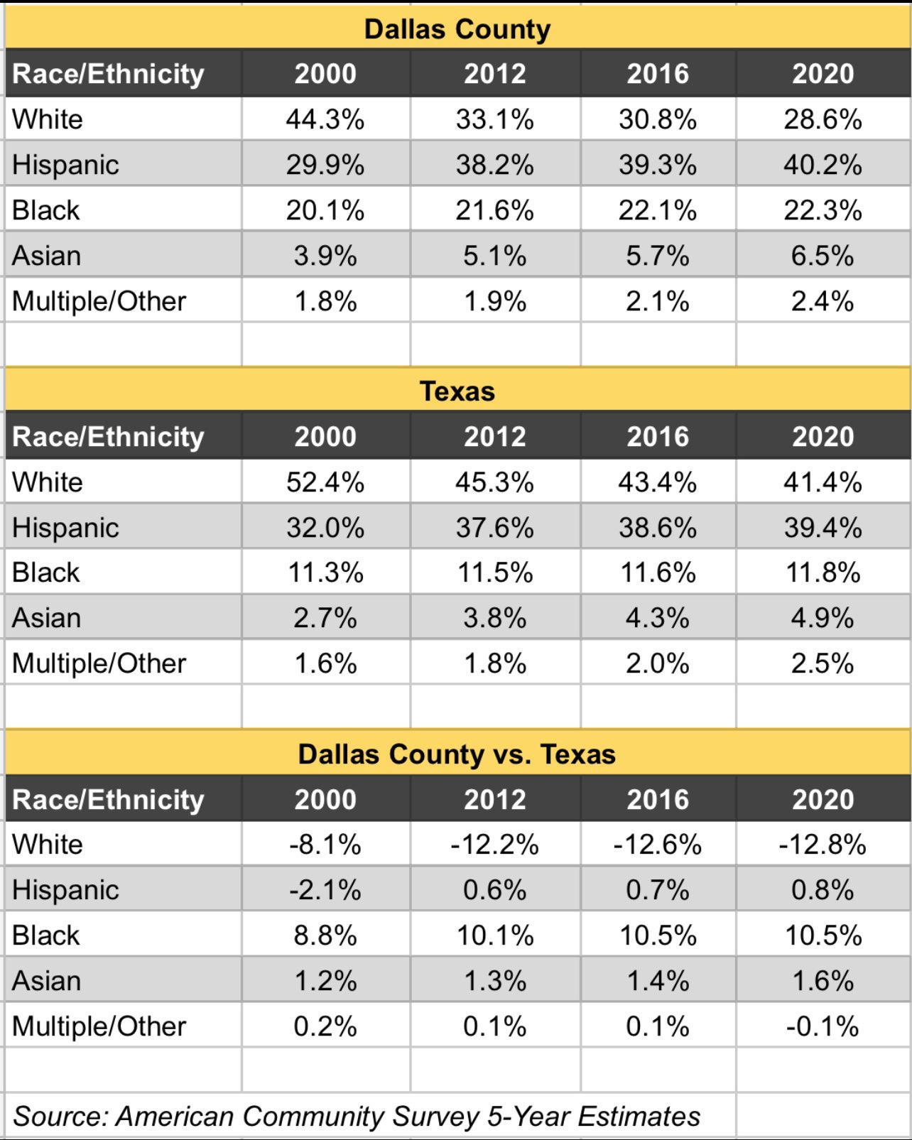 Dallas County is the second-most populous county in Texas and a majority-minority county. The population is 40% Hispanic, 28% white, 22% Black, and 6% Asian. Dallas County is much more diverse than Texas as a whole, being 13 points less white and 10.5 points more Black than the state’s population.