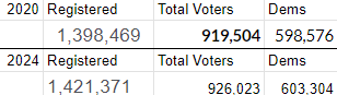 Now, let’s say those numbers don’t change in 2024. With 1.42 million registered voters, we see a 65.75% voter turnout, with 65.1% going to the Democrats. Then that’s just over 603,000 votes.