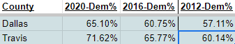 Over the last several presidential election cycles, both Travis County and Dallas County have made significant Democratic gains. Eventually, one of them will plateau… maybe.