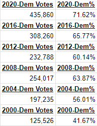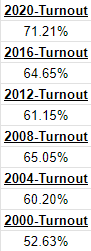 Their voter turnout has been typical in the past, but it was drastically improved in 2020, with 71.21% of registered voters (both sides of the aisle) showing up.