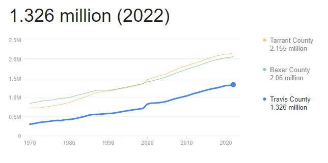 This trend will continue, with an expected 1.5 million population by 2030 and as many as 2 million by 2050. By all indications, Travis County will only continue to get bluer over time. Currently, almost 5% of all Texas Democrats live here.
