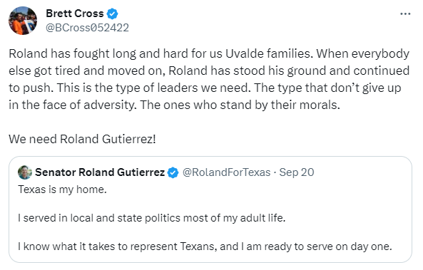 When tragedies strike in Texas, like Uvalde, we almost always see a moment of “thoughts and prayers” from our Republican leaders, and then they abandon the families. Greg Abbott, Dan Patrick, and Uvalde Congressman Tony Gonzalez long ago abandoned the Uvalde families. When the TV cameras left, the Republicans went with them. But Roland Gutierrez has stuck by their side, continuing to fight for answers and to push against the Republicans’ blockade against sensible gun measures.