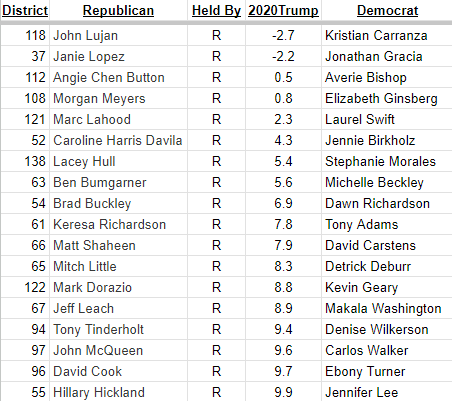 There are 18 Republican-held seats that Trump had less than a +10 win in 2020 (based on the precinct-level data after redistricting.)