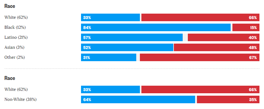 According to the 2020 Census, Texas is 39.8% white (non-Hispanic), 39.3% Hispanic, 11.8% Black, and 5.4% Asian. Of course, that doesn't include the half-million Texans who were undercounted. The only states/areas less white than Texas are Washington, DC, New Mexico, California, and Hawaii. Once again, all blue states.