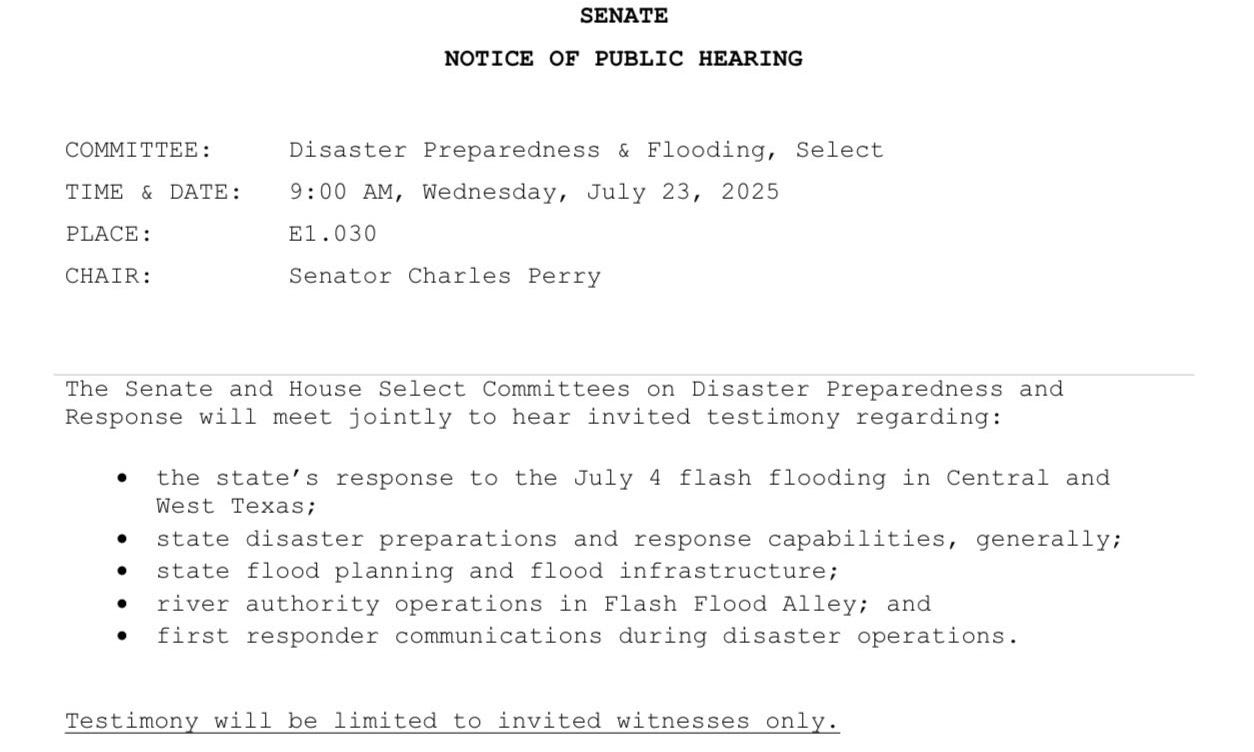 The Select Committee on Disaster, Preparedness, and Flooding, a joint committee comprising both Senators and House members, will meet on Wednesday at 9:00 a.m. The testimony is limited to invited witnesses only, and I expect it will be a tough hearing to sit through, especially considering the search and rescue is ongoing.