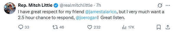 All the Texas Republicans are currently crashing out over Talarico’s interview on Joe Rogan. Senator Mayes Middleton (who is running for Attorney General) is running around calling Talarico a fake Christian, saying there is no separation between church and state, and you’re supposed to subjugate women. And Mitch Little even tweeted Rogan, practically begging him to let him on his podcast for a rebuttal. 🤣