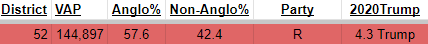 A +4.3 Trump district in 2020 should be a +1 Biden district in 2024. Of course, that remains to be seen, but several other factors are in play when considering HD52 as a voting district.
