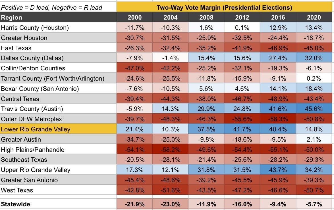 The Greater Austin Area, which includes Williamson, Bastrop, Caldwell, and Hays Counties, has gone from +34.7 (R) in 2000 to +2.1 (D) in 2020.