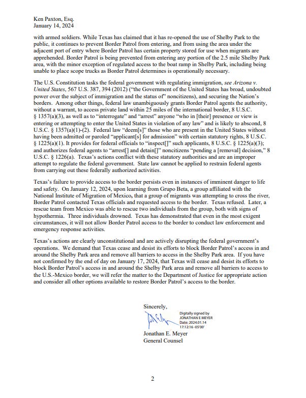 DHS is giving Texas until the end of the day on Wednesday to say it “will cease its efforts to block Border Patrol’s access in and around the Shelby Park area and remove all barriers to access to the U.S.-Mexico border.” Otherwise, they’ll report the matter to the Department of Justice.
