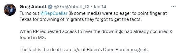 It’s a lie. Personnel on the ground confirmed Abbott was lying. The reporting from Texas Public Radio on the border, particularly from Pablo De La Rosa, has been accurate and verified by multiple major national networks. Some have already accused Abbott of brewing up another “Uvalde-like” coverup.