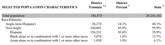 Using this strategy, she spent $1.4 million on her campaign and barely got 20,000 votes in a district with 135,000 voters. She won, with 14% of the district’s voters casting a ballot for her. Ironically, only 14% of this district’s population is Anglo.