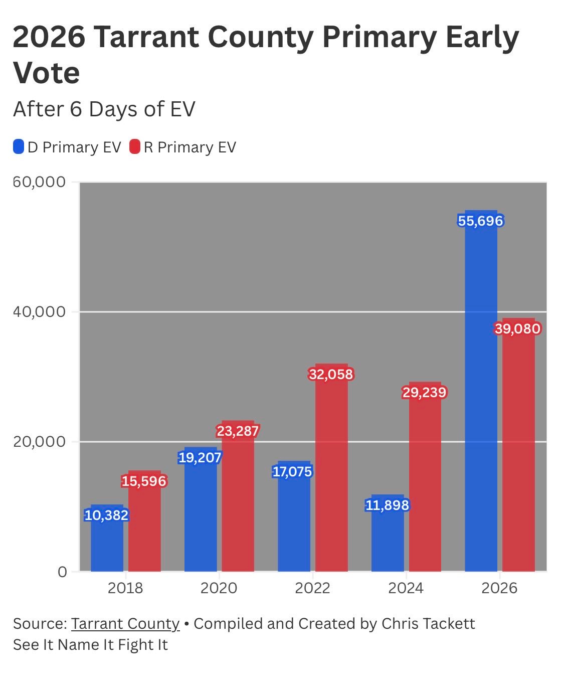Tarrant County: Democrats are up over Republicans by 15,000. Graph by Chris Tackett.