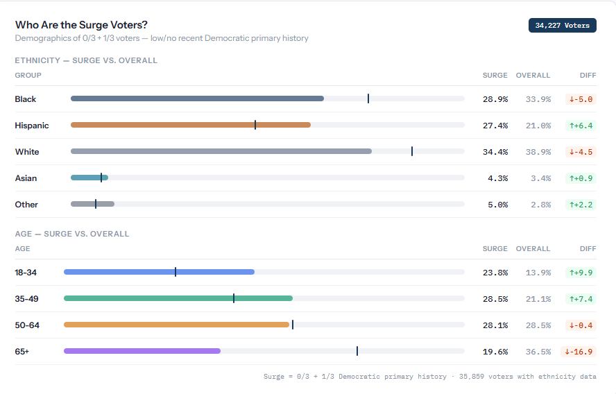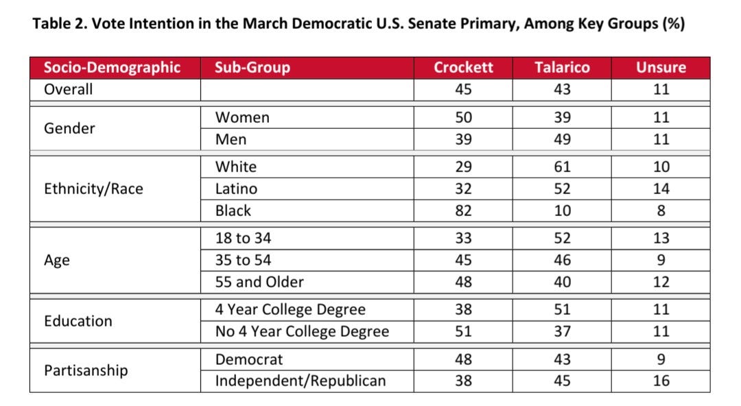 It appears that the polls are surging in the groups where Talarico was most favorable, and slumping with the groups where Crockett was most favorable. Crockett will need to win Harris County to win the primary.