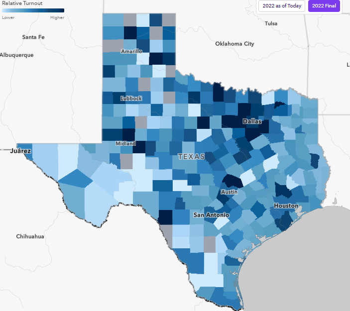 And maybe you’re thinking, that’s a surge for Crockett! And it might be. Maybe everyone in Dallas County has Crockett fever, but we don’t have a fancy dashboard for Dallas County. Only 23,822 Republicans have cast ballots in Dallas, yet Dallas is reliably blue.
