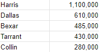 Based on these five counties alone, we’re looking at 2.9 million Democratic votes in November.