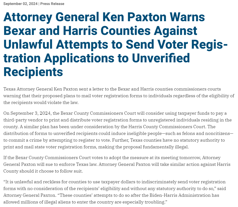Paxton argued that this plan would use taxpayer money to send forms to potentially ineligible individuals (such as felons or non-citizens), which could lead to illegal attempts to register to vote and is against Texas law. He claims that counties do not have the legal authority to print and mail these forms and warns that he will take legal action if the counties proceed with their plans.