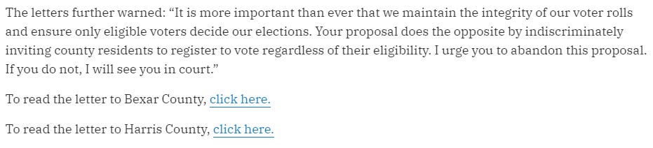 Monday, Ken Paxton sent letters to both counties warning them he would sue if they proceeded with voter registration.