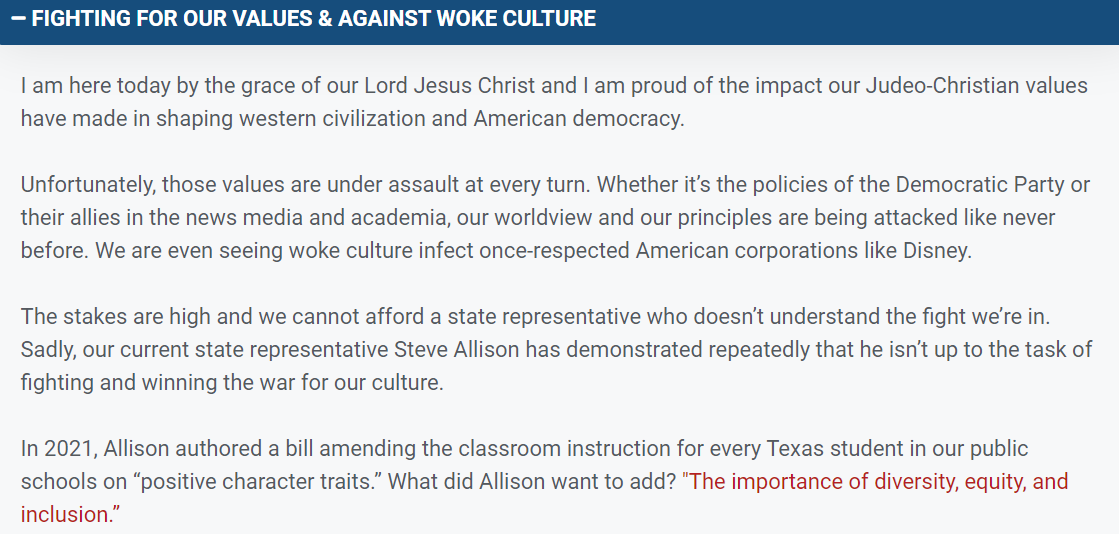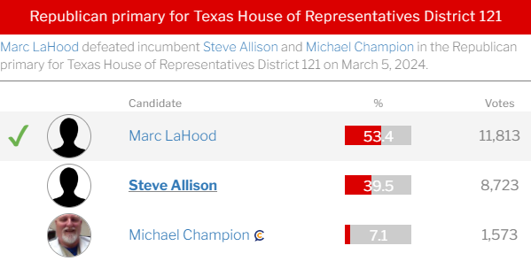 House District 121 used to be the seat of Steve Allison, one of the last moderate Republicans in Texas. However, Allison voted against school segregation vouchers in the previous legislative session, so he became a prime target for Governor Greg Abbott to spend Jeff Yaas’ $10 million haul on.