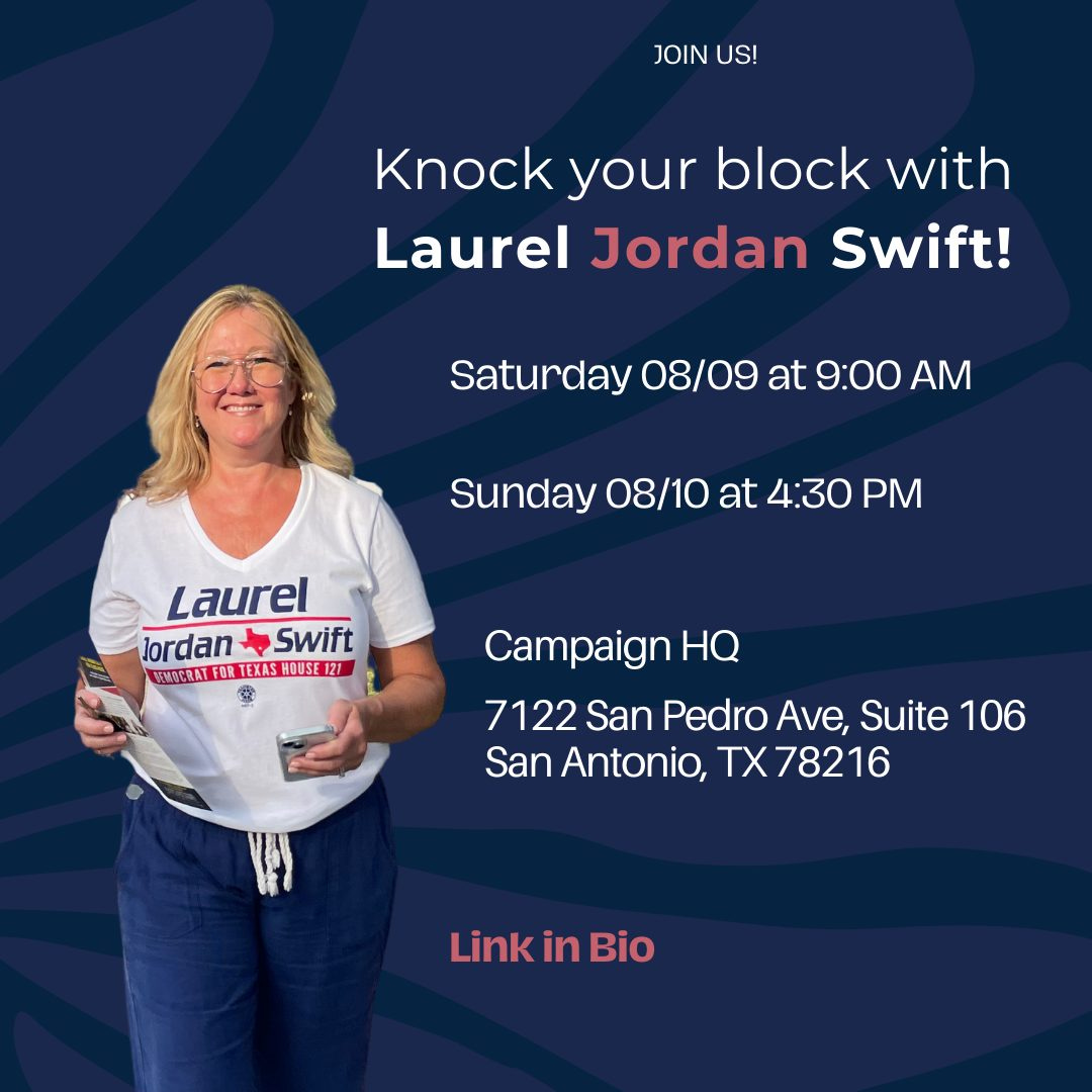 These are all good signs for Laurel Jordan Swift in HD121. Because Bexar County is so instrumental in flipping Texas this year (fingers crossed), we know many people are on the ground working to ensure voters turn in November. That includes Swift, who is doing regular block walking.