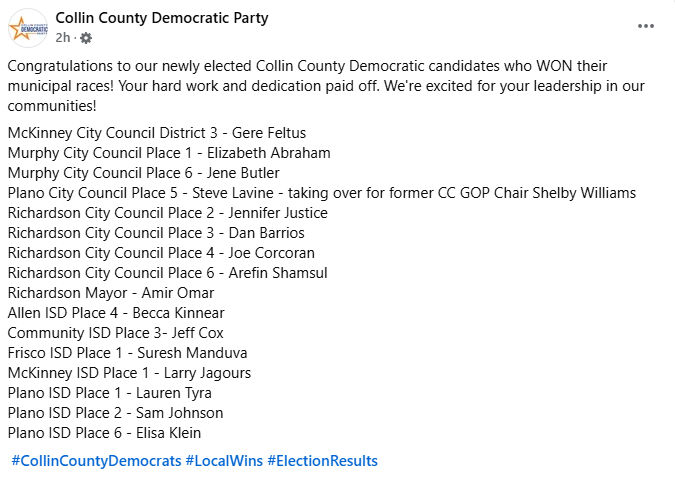 Let’s take a minute to appreciate what just happened in Collin County, a place long written off as deep red, where Democrats were supposed to lose politely and keep quiet about it. Not this year. Up and down the ballot, Democrats broke through in a big way, flipping seats and shaking up school boards in cities that the GOP used to treat as safe territory. To be clear, Democrats in Collin County have been busting their humps for years and this year, it’s paying off.